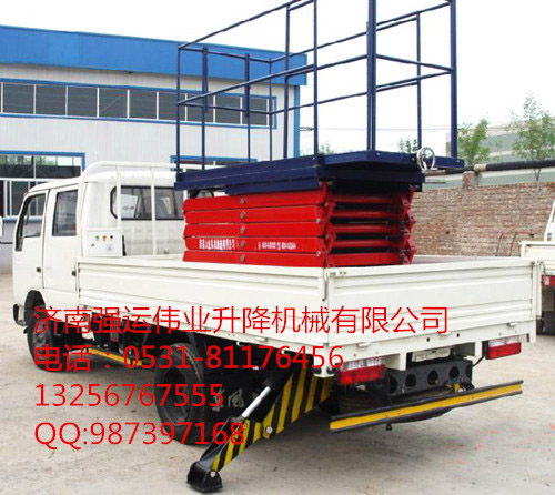 產品規(guī)格:本類產品根據升降高度可分為4、6、8、10米升降平臺,設備載重300公斤至500公斤,客戶可根據需求選用解放、東風、輕騎、福田、電瓶車等任何車型,設備直接采用汽車或電瓶的直接動力升降。